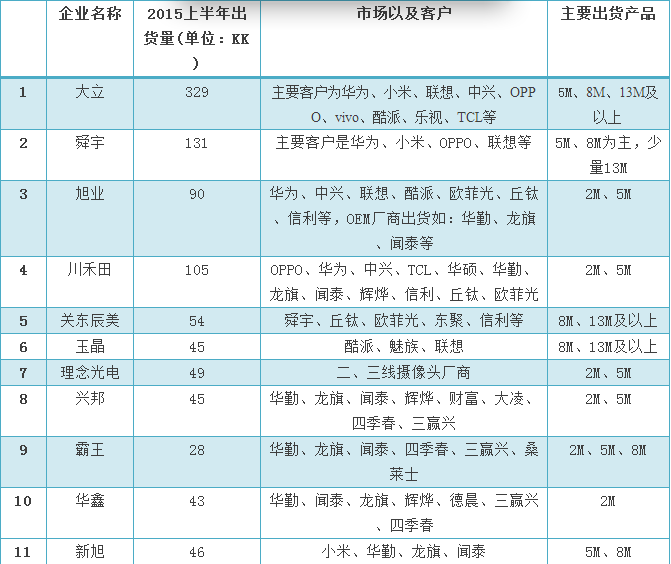 下表為2015年上半年中國安卓手機攝像頭鏡頭出貨量(不含國外品牌)