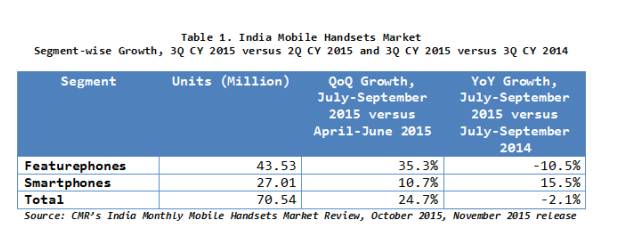 2015Q3印度手機(jī)市場(chǎng)增長25%,但是智能手機(jī)和前一季度相比只增長了11%。第三季度智能手機(jī)占印度手機(jī)銷量的38%,和前一季度相比份額下降5%。