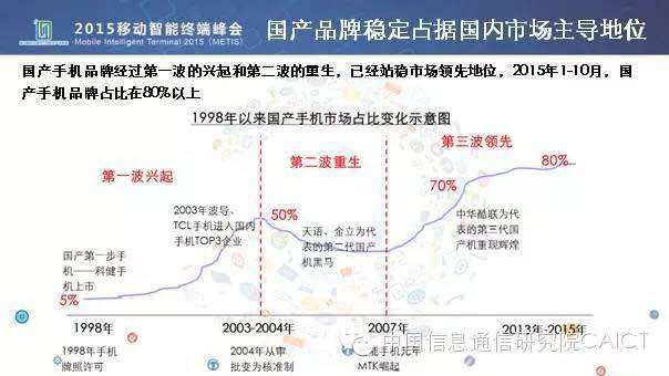 我們回顧一下整個國產(chǎn)手機品牌發(fā)展的歷史,我們看到這是一個應(yīng)該說波瀾壯闊的歷史從1998年我們國產(chǎn)手機的市場占有率不到5%,到2003、2004年間有些國產(chǎn)手機品牌進入,比如波導、TCL,那個時間點是我們國產(chǎn)手機第一次市場占有率超過50%,2007年,特別是智能手機發(fā)展元年那一時刻起,國產(chǎn)手機品牌廠商應(yīng)該說抓住了機遇,一路提升了我們的市場占有率,從60%、70%一直到現(xiàn)在的80%,應(yīng)該說國產(chǎn)的品牌穩(wěn)定的占據(jù)了國內(nèi)市場的主導地位,這是非??上驳默F(xiàn)象。