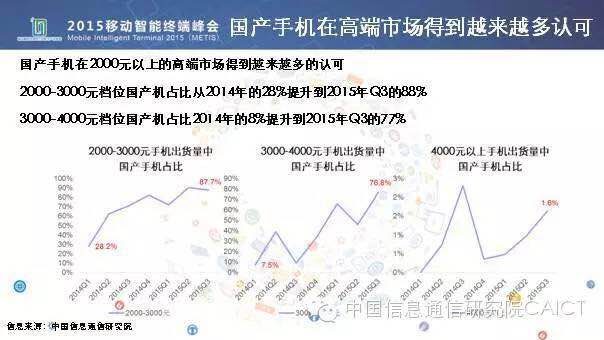 還有一個特點是大家也能夠感受到的,國產(chǎn)手機在高端市場得到越來越多的認可,通過我們的監(jiān)測數(shù)據(jù)也能很清晰看到這一點,在2000到3000元手機價位中,出貨量我們國產(chǎn)的手機占比已經(jīng)從2014年第一季度的28%到現(xiàn)在的88%左右,在3000到4000價位手機的出貨量當中,國產(chǎn)的手機占比已經(jīng)從2014年第一季度的7.5%增長到2015年第三季度的76.8%。當然比較遺憾,4000元以上的手機的出貨量當中,國產(chǎn)手機占比在2%以內(nèi),應(yīng)該說國產(chǎn)手機基本上沒有進入4000元這樣一個價格的空間。