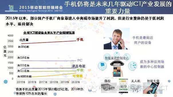 我們對2016年手機發(fā)展趨勢做出判斷,第一個,我們也計算了一些規(guī)模和一些終端相關(guān)的市場,我們發(fā)現(xiàn)其實移動智能終端,手機仍將是未來幾年驅(qū)動ICT產(chǎn)業(yè)發(fā)展最重要的力量,雖然我們看包括可穿戴、智能硬件等發(fā)展很快,但是整體規(guī)模以及對整個ICT產(chǎn)業(yè)的影響其實還在一個初始的階段。智能終端,手機占了3000億美元左右,PC大概2000億,后邊更少,我們看到移動智能終端所驅(qū)動整個的ICT制造的產(chǎn)業(yè)以及它所相關(guān)的移動互聯(lián)網(wǎng)服務(wù)等,仍將是ICT產(chǎn)業(yè)最重要的驅(qū)動力量。