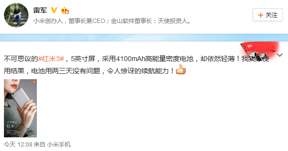 雷軍再秀紅米Note3續(xù)航 待機18小時剩余94%
