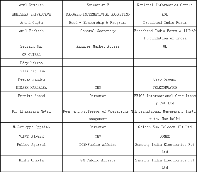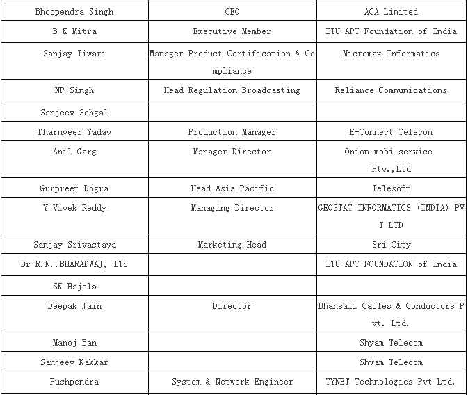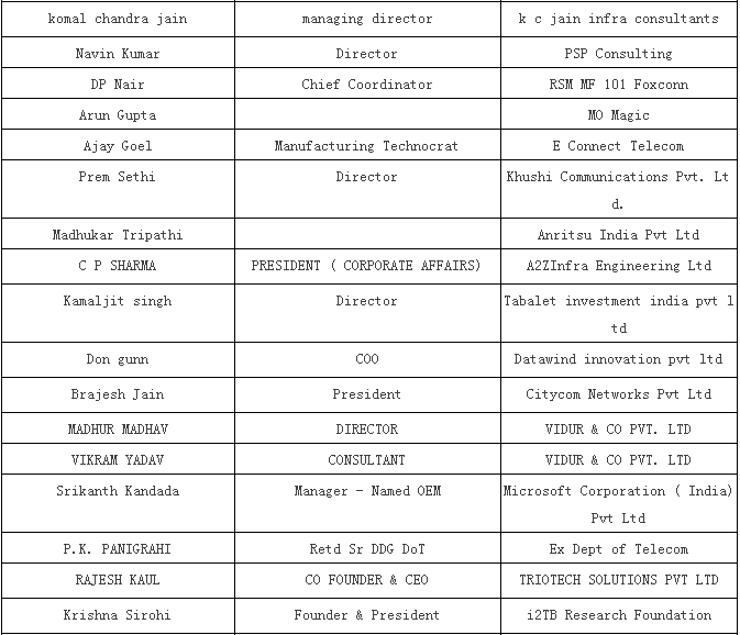 1) Pankaj Mohindroo, National President, Indian Cellular Association (ICA)偏卡舉·牟亨主,印度手機(jī)協(xié)會(huì)國(guó)內(nèi)總裁 2) TECNO 傳音 3) HoliTech 合力泰 4) Micromax (Sunil Joon ) 5) Vivo 6) Mr. Lai, Head - Quality, Sprocomm禾苗質(zhì)量部總監(jiān)賴先生 7) Wind (a Chinese company which is into IDH – designing of PCBA and has set up a factory in Mumbai recently ) (進(jìn)入IDH的中國(guó)公司 – 設(shè)計(jì)PCBA且近期已經(jīng)在孟買建立工廠) |