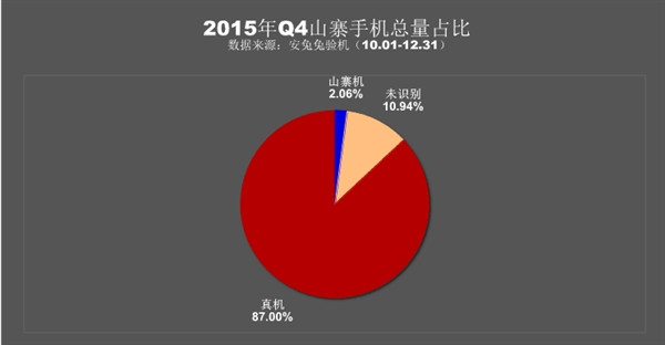 2015年Q4季度總驗機數量為5073591,其中山寨機數量為100384(數據中不含未知機型,不含測試結果未提交機型)。