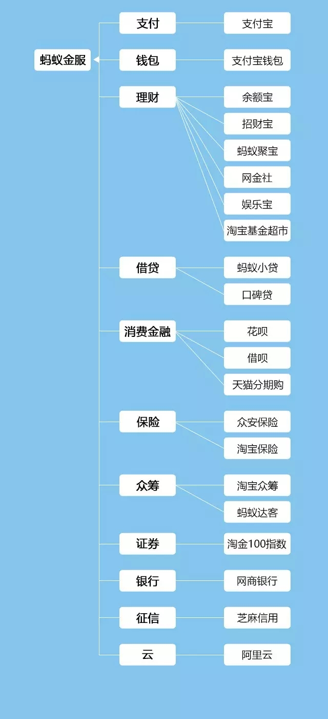 目前,螞蟻金服幾乎已經(jīng)涵蓋了所有的互聯(lián)網(wǎng)金融業(yè)務(wù)。