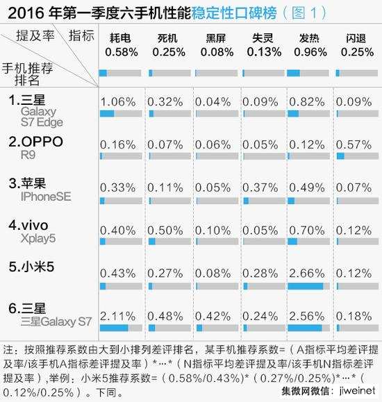本刊以每項(xiàng)指標(biāo)提及率的平均值為基準(zhǔn),定義一個推薦系數(shù)來綜合考量一個機(jī)型各項(xiàng)指標(biāo)在基準(zhǔn)上下浮動的范圍大小。性能穩(wěn)定性比較的結(jié)果顯示,三星S7系列的S7Edge和S7評分結(jié)果懸殊,S7Edge的性能最為穩(wěn)定,而便宜800元的S7被消費(fèi)者投訴耗電快、易發(fā)熱,且死機(jī)和黑屏的偶發(fā)概率更高。(如圖1)