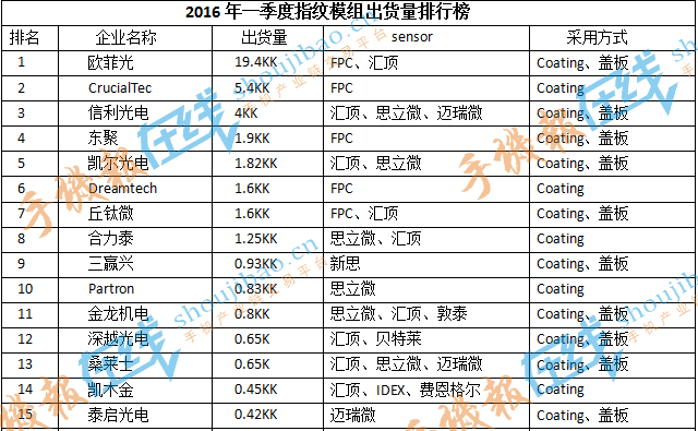 在此之下,國內(nèi)指紋模組廠商在一季度的出貨量也呈現(xiàn)了爆發(fā)式增長,在指紋模組巨頭歐菲光的引領(lǐng)下,模組廠商一季度出貨量一口氣突破了40KK,其增長勢頭著實讓不少業(yè)內(nèi)人士所吃驚。