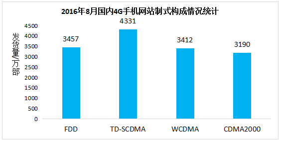 8月4G手機(jī)網(wǎng)絡(luò)制式出貨量最高的是移動的TD-SCDMA,支持該網(wǎng)絡(luò)的手機(jī)達(dá)到4331萬部,占97.6%,環(huán)比下滑0.3%。其余FDD、WCDMA和cdma2000網(wǎng)絡(luò)制式的手機(jī)出貨量分別為3457萬部、3412萬部和3190萬部。