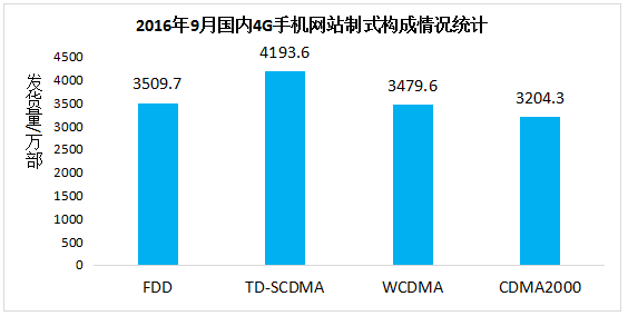 9月4G手機網(wǎng)絡制式出貨量最高的是移動的TD-SCDMA,支持該網(wǎng)絡的手機達到4193.6萬部,占97.5%,環(huán)比下滑0.1%。其余FDD、WCDMA和cdma2000網(wǎng)絡制式的手機出貨量分別為3510萬部、3480萬部和3204萬部。