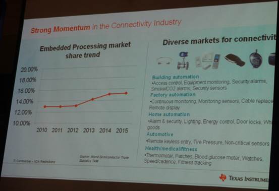 創(chuàng)新閃聯(lián)標(biāo)準(zhǔn)發(fā)布儀式揭牌之后,TI副總裁 Kim Wong分析了目前物聯(lián)網(wǎng)領(lǐng)域的市場(chǎng)狀況。目前物聯(lián)網(wǎng)處于強(qiáng)勁發(fā)展勢(shì)頭,嵌入式處理市場(chǎng)份額的發(fā)展一路高歌,市場(chǎng)占有率從2010年13%到2015年得15%。