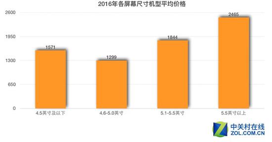 各尺寸區(qū)間對(duì)應(yīng)的價(jià)格方面,4.5英寸及以下機(jī)型均價(jià)1571元;4.6-5.0英寸1299元;5.1-5.5英寸均價(jià)1844元;5.5英寸以上由于聚集了大部分品牌旗艦,所以均價(jià)達(dá)到了2465元。其中造成4.5英寸以下機(jī)型均價(jià)“偏高”的主要原因也是iPhone SE售價(jià)相對(duì)較高造成。