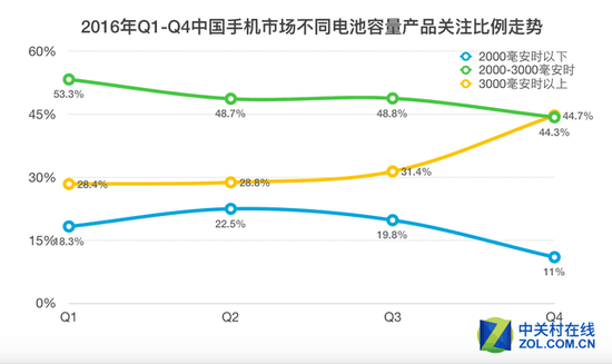 2016年發(fā)布的新機(jī)所攜帶電池容量主要集中在2000——3000mAh以及3000mAh以上兩段。而關(guān)注度方面,2000——3000mAh容量段關(guān)注度最高為48.8%,其次為3000mAh以上容量段;時(shí)間線上,3000mAh容量以上的機(jī)型關(guān)注度逐季度升高,進(jìn)入秋冬季節(jié)鋰電池因化學(xué)原因變得不夠耐用、加上三星與蘋果頻發(fā)的電池問(wèn)題都使得智能手機(jī)電池、特別是高電池容量的機(jī)型在公眾當(dāng)中越來(lái)越受到關(guān)注。
