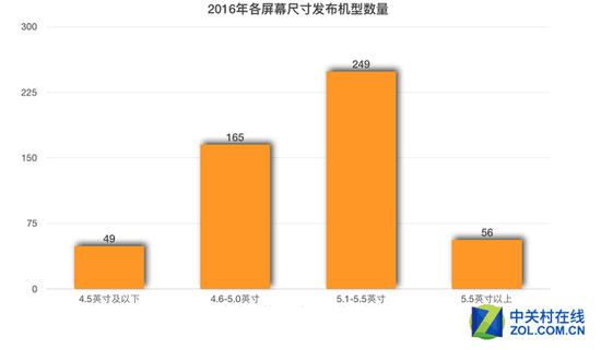 具體數(shù)量上,2016年全年4.5英寸及以下新品數(shù)量已經(jīng)降至49款;4.6-5.0英寸為165款;主流5.1-5.5英寸是249款;大屏控的最愛(ài)5.5英寸以上新品數(shù)量是56款。