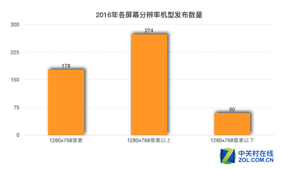 屏幕另一個(gè)重要參數(shù)“分辨率”隨著屏幕尺寸的增長(zhǎng)也出現(xiàn)變化,最明顯的變化是1280768(含720,下同)像素分辨率以下已經(jīng)接近淘汰邊緣,全年發(fā)布新機(jī)數(shù)量?jī)H為60款,而1280768分辨率及大于此分辨率的機(jī)型共計(jì)達(dá)到452臺(tái),占主流。