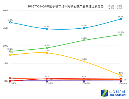 由于驍龍820的出現(xiàn),四核心處理器關(guān)注度一直上升,處理器CPU核心方面,四核與八核仍然占據(jù)絕對(duì)主流,而且兩者幾乎平分秋色,但關(guān)注度方面八核明顯高于四核;四核產(chǎn)品當(dāng)中兩極分化比較嚴(yán)重,主要為以A10、驍龍820與821代表的高端四核平臺(tái),以及聯(lián)發(fā)科低端四核A53;八核產(chǎn)品分布則比較平均,涵蓋中高低端,big.LITTLE的大核+小核配置決定了它以中端平臺(tái)的配置為主。