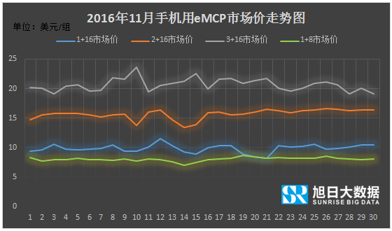 旭日大數(shù)據(jù)研究數(shù)據(jù)顯示,2016年11月,小容量1GB+8GB的eMCP市場平均價格相對比較穩(wěn)定,小容量eMCP供應(yīng)商有可選余地,價格波動就沒有那么明顯。