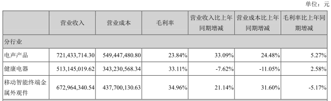 按產(chǎn)品劃分來(lái)看的話,奮達(dá)科技電聲產(chǎn)品營(yíng)收為7.21億元,占比34.30%,同比增長(zhǎng)33.09%,其毛利率為23.84%,同比上升5.27%;健康電器營(yíng)收為5.13億元,占比為24.39%,同比下降7.62%,毛利率為33.11%,同比上升2.58%;移動(dòng)智能終端金屬外觀件營(yíng)收為6.72億元,占比為31.99%,同比上升21.14%,毛利率為34.96%,但是同比下降了5.17%。