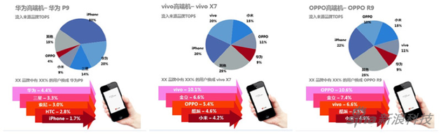 尤為一提的是,在高端市場(chǎng),華為OV新三強(qiáng)對(duì)蘋果形成了不小挑戰(zhàn)。以華為P9、OPPO R9、vivoX7為例, iPhone都成為最重要的流入來源品牌。其中華為P9的新機(jī)來源占比中,蘋果占比最高,達(dá)到38%;vivo X7的換機(jī)流入品牌中,iPhone以20%的流入比例與本品牌持平;而OPPO R9則獲得了iPhone用戶22%的流入占比,高于本品牌18%的流入比例。