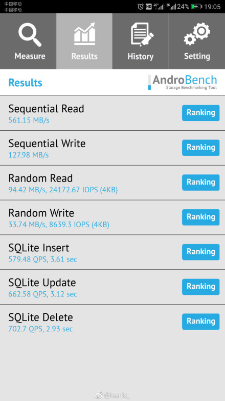 據(jù)網(wǎng)友軟件測(cè)試截圖顯示,抵擋跑分為300MB/s左右,中檔為600MB/s左右,高檔為800MB/s!網(wǎng)友質(zhì)疑是華為把EMMC5.1、UFS2.0和UFS2.1混著用!同時(shí),網(wǎng)友質(zhì)疑,P10內(nèi)存縮水,運(yùn)存為DDR3而不是官宣的DDR4!網(wǎng)友紛紛跑到余承東微博下方留言怒懟華為P10!