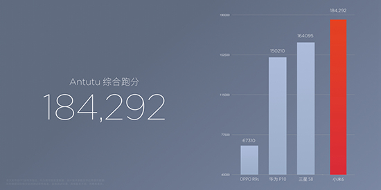 小米6搭載中國(guó)首發(fā)全球第一顆10nm制程商用芯片高通驍龍835處理器,全新Kryo 280架構(gòu)、主頻高達(dá)2.45Ghz。不服跑個(gè)分?經(jīng)安兔兔跑分軟件測(cè)試,小米6的綜合跑分184292分,GFXBench曼哈頓離屏測(cè)試GPU跑分63fps,遠(yuǎn)超友商旗艦(以華為P10、OPPO R9s和三星S8為例)。