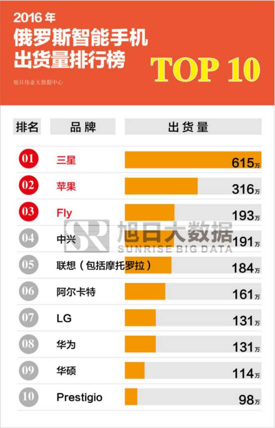 此外,聯(lián)想、阿爾卡特、華為、華碩分別排在第五、六、八、九位。三星、蘋果這兩個國際品牌依然強勢,分別以約615萬和316萬的出貨量占據(jù)一、二位;以價格取勝的俄羅斯本土品牌Fly位居第三,出貨量約193萬。