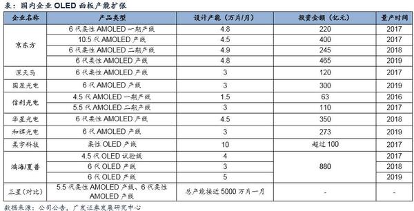 截至2016年,我國OLED面板產(chǎn)能不足全球產(chǎn)能的0.1%。但是,隨著技術(shù)跟進以及資本助力的情況下,發(fā)展勢頭良好的OLED產(chǎn)業(yè)鏈中游企業(yè)有望加速切入全球超過150億美元規(guī)模的OLED面板市場,最終將與OLED的旺盛需求形成供需共振,帶來業(yè)績的巨大彈性。