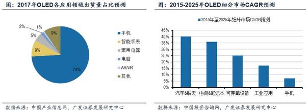 OLED相比LCD能夠滿足汽車、航天電子的高性能、環(huán)境適應(yīng)性要求。據(jù)IDTechEx預(yù)測,2015年至2025年間該領(lǐng)域OLED市場年復(fù)合增長率高達約40%;