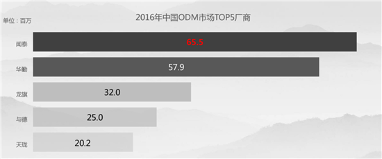 從2016年中國ODM市場的TOP5來看,聞泰、華勤、龍旗、與德、天瓏分居TOP5之列。