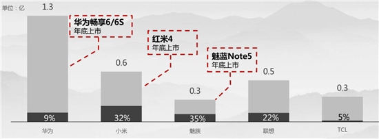 2016年華勤(華為暢享5S)、龍旗(紅米Note3)單品銷量分別占據(jù)1、2位,3——6位都由聞泰機型占據(jù),涵蓋魅族、小米、中移動的主力出貨機型。
