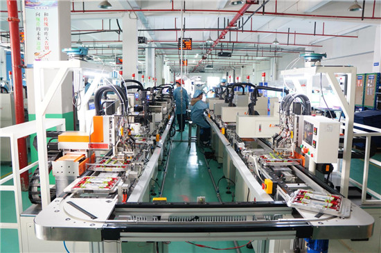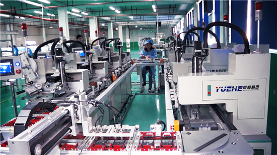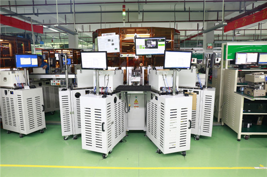 走進聞泰工廠內(nèi)部,隨處可見自動化的智能生產(chǎn)測試設(shè)備。圖為機器人智能測試設(shè)備,可以實現(xiàn)手機測試無人化。