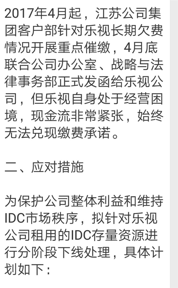 文件顯示,樂視是集團(tuán)政企公司規(guī)定的TOP55重點(diǎn)互聯(lián)網(wǎng)客戶之一,目前在江蘇公司南京、蘇州、無錫三個(gè)地市合計(jì)租用30個(gè)機(jī)柜和290G帶寬,自2016年7月起持續(xù)拖欠IDC資源租用費(fèi),截至2017年5月,全省合計(jì)欠費(fèi)總額達(dá)1426.25萬元,已嚴(yán)重?fù)p害公司利益。