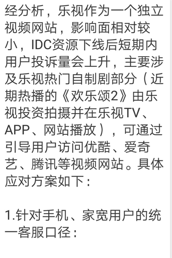 文件指出,IDC資源下線后,短期內(nèi)用戶投訴量會(huì)上升,主要涉及樂視熱門自制劇部分,比如《歡樂頌2》??赏ㄟ^引導(dǎo)用戶訪問優(yōu)酷、愛奇藝等視頻網(wǎng)站。
