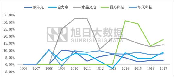 圖表2:2007Q1—2017Q1攝像頭利潤率趨勢圖