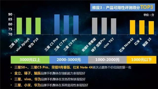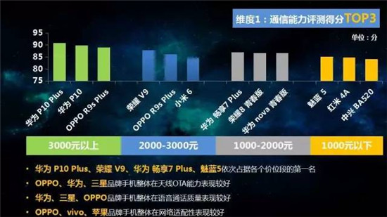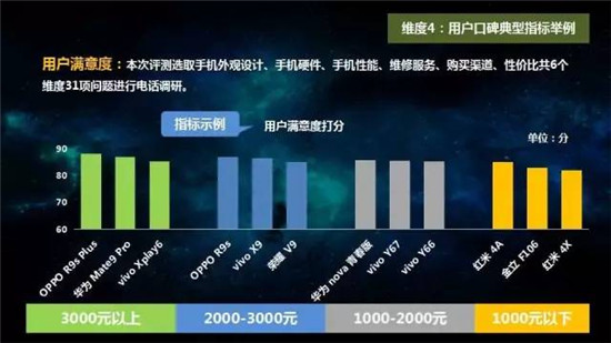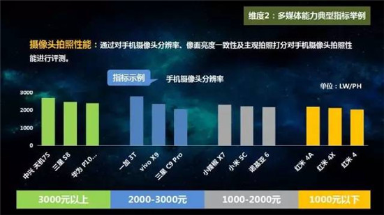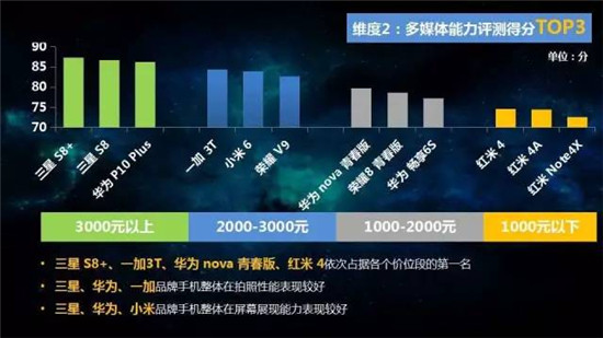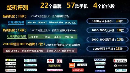 整機測評方面,選取22各品牌、57款手機,從手機通信能力、多媒體能力、產(chǎn)品易用性和用戶口碑四大維度進行評測,并按照不同價位段進行排名。