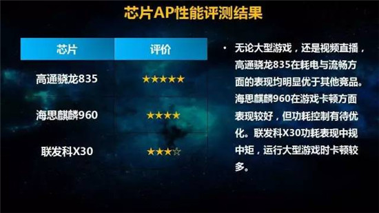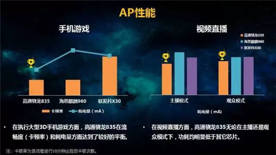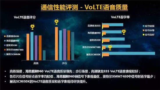 大型3D游戲流暢度和耗電量、視頻直播功耗,驍龍835均領先于其他平臺;在小區(qū)近點、邊緣,驍龍835抗干擾能力最佳;驍龍835在步行場景下VoLTE表現(xiàn)不錯。