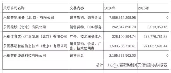 附注十二是“關(guān)聯(lián)方及關(guān)聯(lián)交易”。樂(lè)視管理層的解釋是,樂(lè)視超級(jí)電視熱銷(xiāo),2016年改變了銷(xiāo)售模式,原來(lái)是通過(guò)樂(lè)視致新(子公司)來(lái)銷(xiāo)售的,現(xiàn)在改為通過(guò)關(guān)聯(lián)公司(不是子公司)樂(lè)視智能終端科技有限公司(以下簡(jiǎn)稱(chēng)“智能終端”)進(jìn)行銷(xiāo)售。