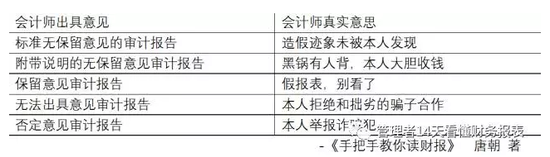 下面這個(gè)表列舉了會(huì)計(jì)師意見(jiàn)與真實(shí)意思的對(duì)比,寫(xiě)的非常有意思: