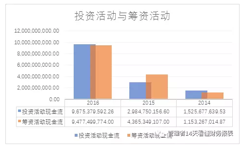 我們可以看到,花在投資活動(dòng)上的錢(qián),從2014年的15億元,到2015年的接近30億元,再到2016年的接近97億元人民幣的流出,讓人簡(jiǎn)直目瞪口呆。這么大筆的投資活動(dòng),錢(qián)是從哪兒來(lái)的呢?從2014到2016年的籌資活動(dòng)現(xiàn)金流可以看到,籌資活動(dòng)也是年年上漲。為了支持2016年的投資活動(dòng),當(dāng)年的籌資活動(dòng)也是蠻拼的,接近95億元了??梢杂靡痪湓捀艣r:有多少花多少;借多少花多少。