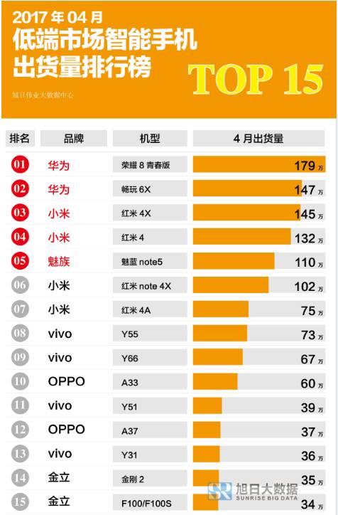為了市場能更直觀了解手機市場的競爭現(xiàn)狀,旭日大數(shù)據(jù)從2017年開始推出月度暢銷機型排行榜數(shù)據(jù),從4月份開始,更是把暢銷機型排行榜進(jìn)一步拆分為高端市場、中端市場和低端市場暢銷機型排行榜。通過不同價位段的暢銷機型出貨量數(shù)據(jù),可以一目了然地看到現(xiàn)在國內(nèi)手機市場品牌之間的市場地位情況。暢銷機型排行榜自發(fā)布以來,受到了來自品牌、ODM和手機產(chǎn)業(yè)鏈企業(yè)的極大關(guān)注,而根據(jù)旭日大數(shù)據(jù)的調(diào)研團隊反饋,ODM廠商看了暢銷機型排行榜之后,很多企業(yè)老板睡不著覺了,這是為何?現(xiàn)在我們先從手機品牌方面看看排行榜中呈現(xiàn)了一種怎樣的現(xiàn)象。