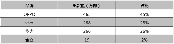 從中端暢銷機型排行榜看,同樣是TOP15的機型,上榜的機型就僅剩下OPPO、vivo、華為、金立4個品牌,并且品牌占比份額更為集中。排名第一的OPPO上榜機型達(dá)到5款,占比達(dá)到45%;vivo上榜機型則為4款,占比為28%;華為有5款機型上榜,占比為26%。中端市場排行榜的前三品牌占比高達(dá)98%,光是OPPO已經(jīng)占據(jù)中端暢銷機型近一半的量,與第二名的vivo差距明顯拉大不少,中端智能機市場可謂高度集中。