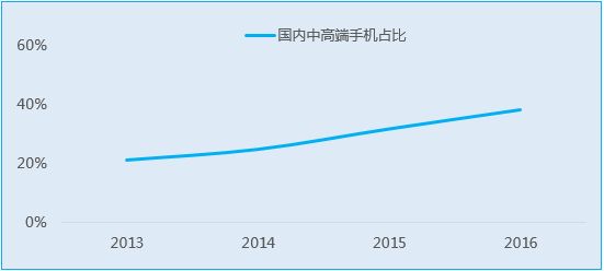 圖表 1 2013-2016年國內(nèi)中高端機型出貨量占比