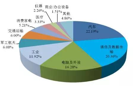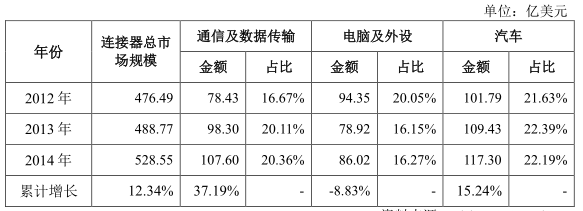 作為手機、電腦等消費類電子核心部件之一,且主要分布在北美、歐洲、日本、中國以及亞太其他地區(qū),目前連接器應(yīng)用范圍越來越廣泛,在各類設(shè)備中成為能量、信息穩(wěn)定流通的橋梁,從市場應(yīng)用領(lǐng)域來劃分,主要可分為汽車、通訊、電腦及外設(shè)、工業(yè)、軍工航天,2014年這五大領(lǐng)域合計市場占比高達76.88%。
