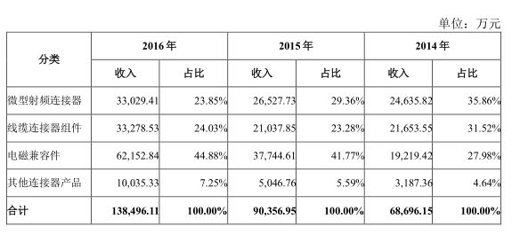 而從電連技術(shù)微型射頻連接器、電磁兼容件以及線纜連接器組件三大類主營產(chǎn)品劃分來看,2014年以來,其電磁兼容件業(yè)務(wù)營收增長速度十分之快,目前在其總營收中占比已經(jīng)從27.98%提高到44.88%,而線纜連接器組件則相應(yīng)的從31.52%下降到24.03%。