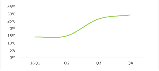 圖表2 2016-2017年小米智能機出貨量海外市場占比(分季度)