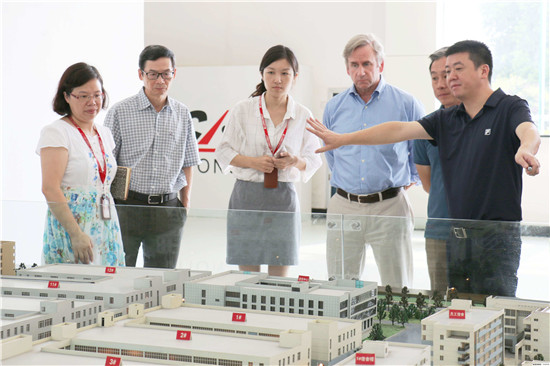 聞泰科技董事長(zhǎng)張學(xué)政向高通公司客人介紹聞泰生產(chǎn)中心規(guī)模和規(guī)劃