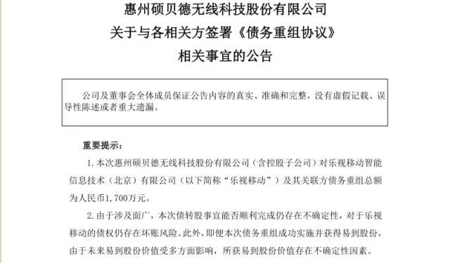 據(jù)悉,2016年10月,樂(lè)視移動(dòng)和碩貝德簽訂了《采購(gòu)框架協(xié)議》;2016年1月5日,樂(lè)視移動(dòng)和江蘇凱爾簽訂了《采購(gòu)框架協(xié)議》。本次債務(wù)重組中,樂(lè)視移動(dòng)委托關(guān)聯(lián)方吳孟或者Lucky向碩貝德進(jìn)行相應(yīng)欠款的支付。本次欠款是指碩貝德(含子公司)對(duì)樂(lè)視移動(dòng)1700萬(wàn)元人民幣債權(quán)。