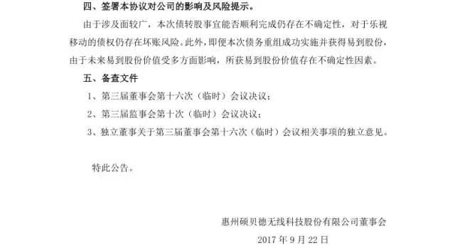 通過(guò)上述股權(quán)轉(zhuǎn)讓,樂(lè)視移動(dòng)方面向碩貝德支付1689萬(wàn)元和11萬(wàn)元的欠款,以結(jié)清債務(wù)重組協(xié)議約定的樂(lè)視移動(dòng)對(duì)碩貝德(含子公司)的人民幣1700萬(wàn)元欠款。后續(xù)股權(quán)轉(zhuǎn)讓事宜,具體按各方另行簽署的《股權(quán)轉(zhuǎn)讓協(xié)議》執(zhí)行。