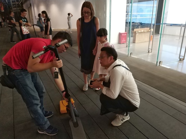 店員正在幫助顧客調(diào)試剛剛購買的電動平衡車。