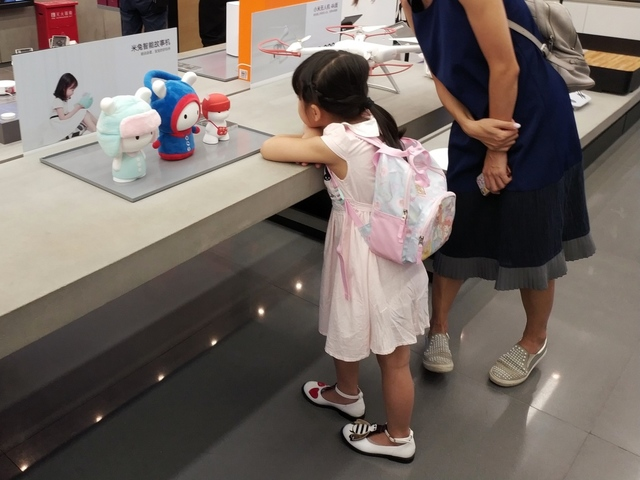 一位可愛的小女孩在媽媽的陪伴下,正在與米家智能故事機互動,小米之家或許可以考慮開辟一塊兒童專區(qū)。