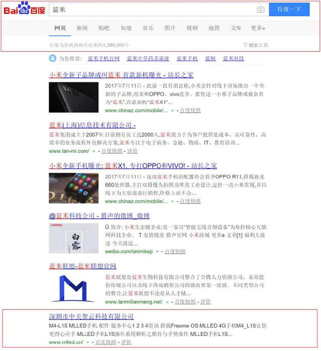 今年7月,有傳聞稱小米將會開辟全新子品牌藍米,還稱首款新機叫作“藍米X1”。一時“藍米”曝光量劇增,引來大家紛紛搜索,卻好巧不巧帶火了名字相似的“米藍”。直到現(xiàn)在在百度搜索“藍米”,還是能在前幾個搜索結(jié)果中找到其官網(wǎng)。